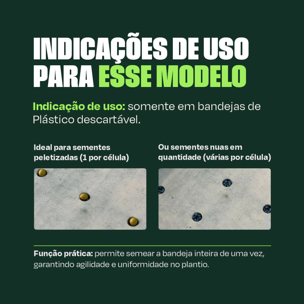 ✔️ Função prática: permite semear a bandeja inteira de uma vez, garantindo agilidade e uniformidade no plantio.